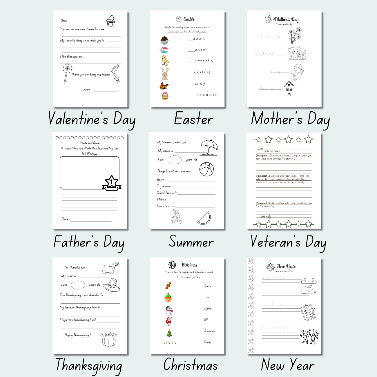 Keep kids engaged, learning, and excited for every season with this comprehensive bundle of over 60 worksheets! Perfect for teachers and parents, the Holiday Writing Activity Pack covers major holidays including: