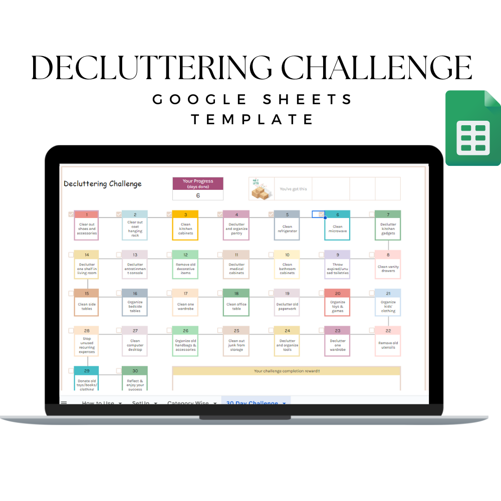 Kickstart your journey to a clutter-free home with our 30-day challenge. Discover newfound motivation as you conquer clutter one day at a time, paving the way for lasting results and a revitalized living space. It includes 3 tabs.