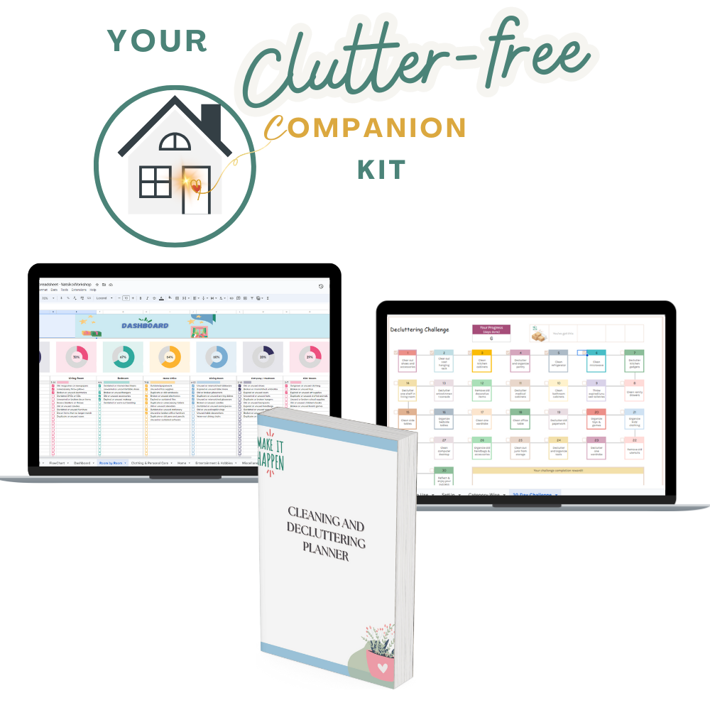 The Clutter-Free Companion Kit includes: an Ultimate Decluttering Spreadsheet, a 30-day Decluttering Challenge Spreadsheet, and a Cleaning and Decluttering Printable Planner. These items will be accessible immediately once your payment is complete. As a bonus, the offer includes an ebook guide and personalized support for one month, including weekly emails with freebies and tips.