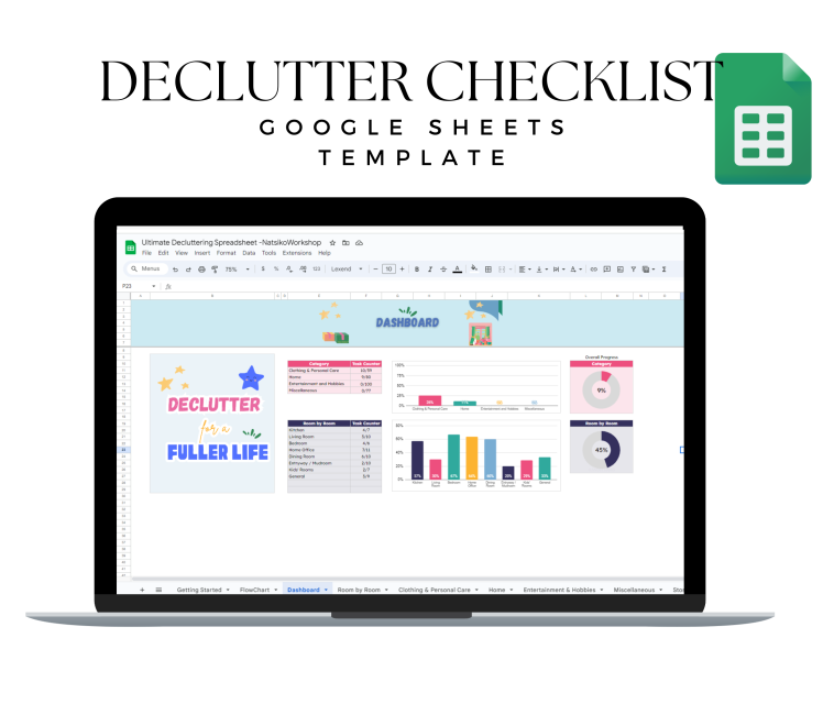 Stay on track and watch your progress unfold effortlessly with this comprehensive spreadsheet. From organizing tasks to tracking your achievements, this user-friendly tool makes decluttering a breeze. It includes 11 tabs: Getting Started, Flowchart, Dashboard, Room by Room, Clothing and Personal Care, Home, Entertainment and Hobbies, Miscellaneous, Storage, Find items, and To-Do List